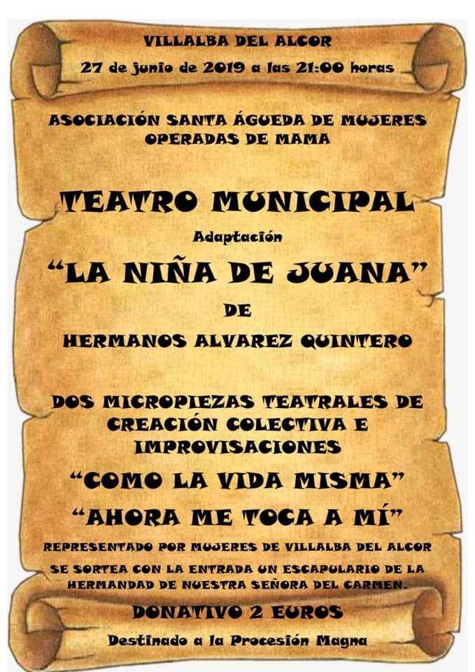 El próximo jueves 27 de junio de 2019, la ASOCIACIÓN SANTA ÁGUEDA de MUJERES OPERADAS de MAMA (ASAMOM) organiza una velada teatral, a las 21:00 h, en el Teatro Municipal de Villalba del Alcor.